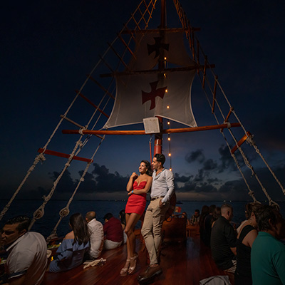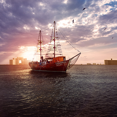 Disfruta los mágicos escenarios durante el recorrido en el majestuoso Galeón Español Columbus Cruise, donde podrás elegir entre un atardecer de película o un anochecer de ensueño navegando sobre la Laguna Nichupté rodeado de complejos de lujo, pequeños y exclusivos hoteles, con una vista panorámica que te invita a pasar una noche inigualable, acompañado por música de saxofón en vivo mientras disfrutas de una deliciosa y exclusiva cena.